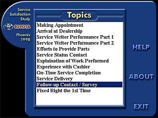 The main menu appears first. On the left side of the screen will be your logo and the project title information. On the right side will be some generic buttons including access to some on-line help, an exit button, and an About button. The About button will access the About Box window which will contain two information pages. The first will be information you supply about your company and the project. The second will be the standard software information. At the center is the topics list. When you click on a topic in the list the video viewer will appear as shown below.